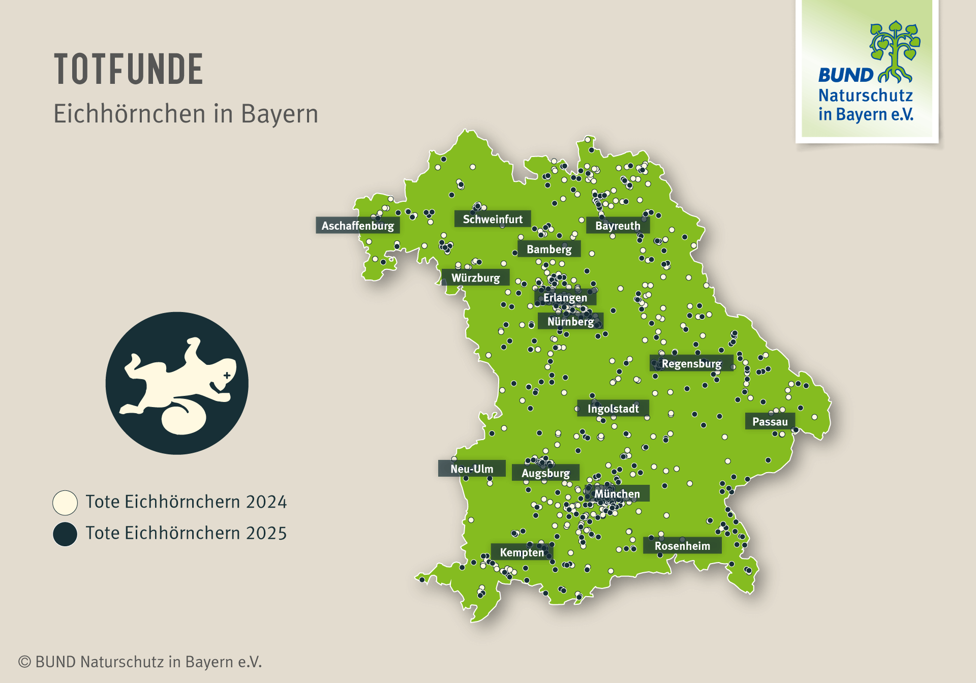 Gleichzeitig gibt es positive Entwicklungen: In Regensburg und Zirndorf gingen die Totmeldungen im Umfeld neu errichteter Eichhörnchen-Seilbrücken deutlich zurück – ein starkes Argument für den weiteren Ausbau solcher Maßnahmen.