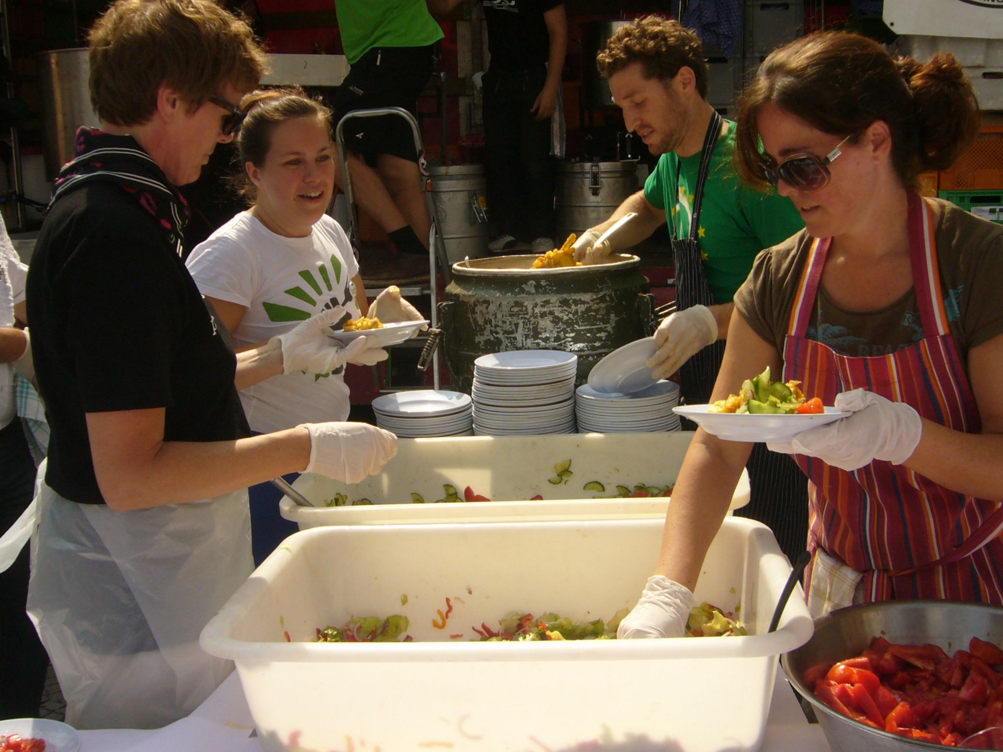 400 Kilogramm nicht-marktkonformes Gemüse von kleinbäuerlichen Öko-Betrieben aus dem Münchner Umland wurden von Helfern und Food-Aktivisten öffentlich geschnippelt und an einer langen Tafel verspeist –