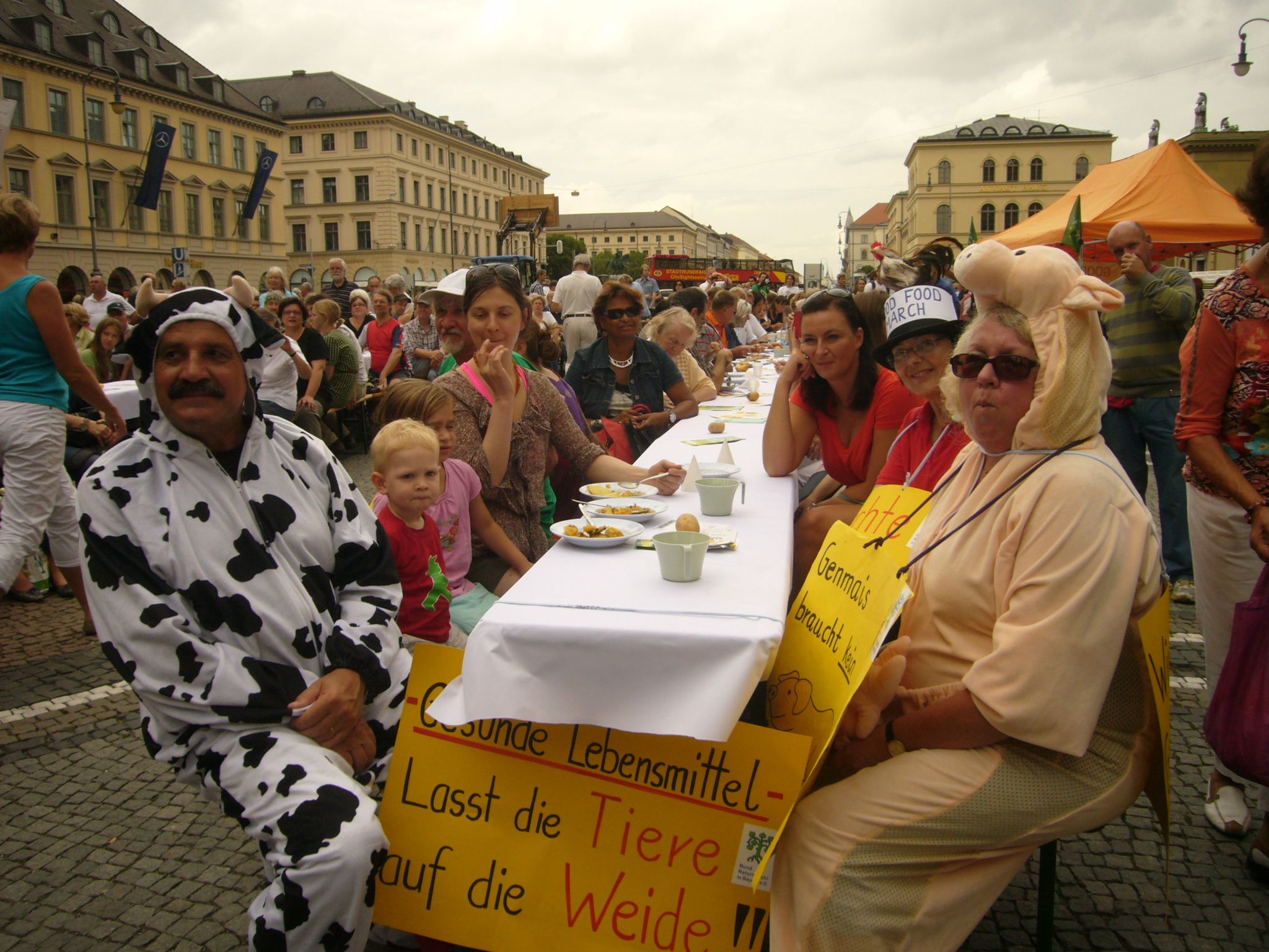 1500 Verbraucherinnen und Verbraucher haben heute auf dem Münchner Odeonsplatz am Aktionstag „Teller statt Tonne“ gegen Lebensmittelverschwendung teilgenommen und ein aus nicht vermarktbaren Gemüse zubereitetes Essen verzehrt. Die Veranstaltung war der erfolgreiche Auftakt zum Good Food March, einer dreiwöchigen Rad- und Treckertour nach Brüssel für eine zukunftsfähige Lebensmittelwirtschaft und eine bäuerliche, sozial- und umweltgerechte Landwirtschaftspolitik. Slow Food Deutschland hatte gemeinsam mit dem Bund Naturschutz in Bayern, dem Evangelischen Entwicklungsdienst, der Arbeitsgemeinschaft bäuerliche Landwirtschaft, Mission EineWelt und der Kampagne Meine Landwirtschaft zu dieser Aktion aufgerufen.