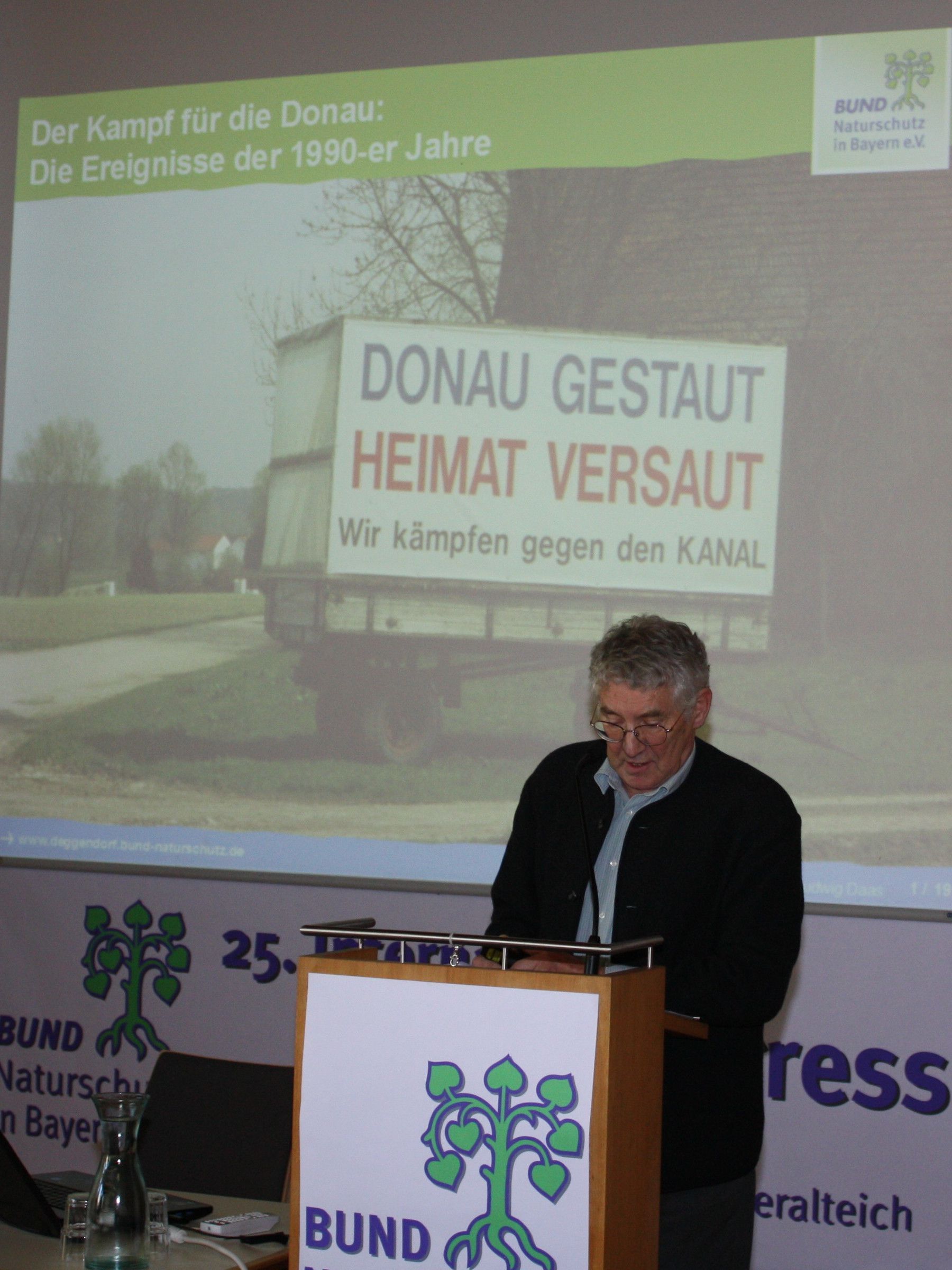 Auch in seinem 25. Jahren war der vom BUND Naturschutz veranstaltete „Internationale Donaukongress“ in Niederalteich bei Deggendorf mit etwa 50 Teilnehmerinnen und Teilnehmern gut besucht. Am Samstag, den 3. Dezember blickten zunächst Hubert Weiger, Vorsitzender des BUND Naturschutz Bayern und des Bundes für Umwelt und Naturschutz Deutschland (BUND) sowie die Mitbegründer und langjährigen Mitorganisatoren, Ludwig Daas und Dieter Scherf, auf die Geschichte des Kongresses zurück. In dem Kongress wurde im Lauf der Zeit nicht nur der Ausbau der Wasserstraße zwischen Straubing und Vilshofen verhandelt; Themen waren außerdem Fragen der Wirtschaftlichkeit von Ausbaumaßnahmen, die Einbindung der Wasserstraße in größere Verkehrskonzepte, die Bedeutung des Flusses und der Auen für den Schutz der biologischen Vielfalt und der Hochwasserschutz sowie die Folgen des Klimawandels. Nicht zuletzt entwickelte sich auch aus dem Kongress ein verstärktes Bewusstsein für die Bedeutung der Natur- und Kulturlandschaft als ein in Europa einmaliges Erbe. Vielfach richtete sich in den Kongressen der Blick auch über die bayerischen Grenzen auf die gesamte Donau bis zum Schwarzen Meer.