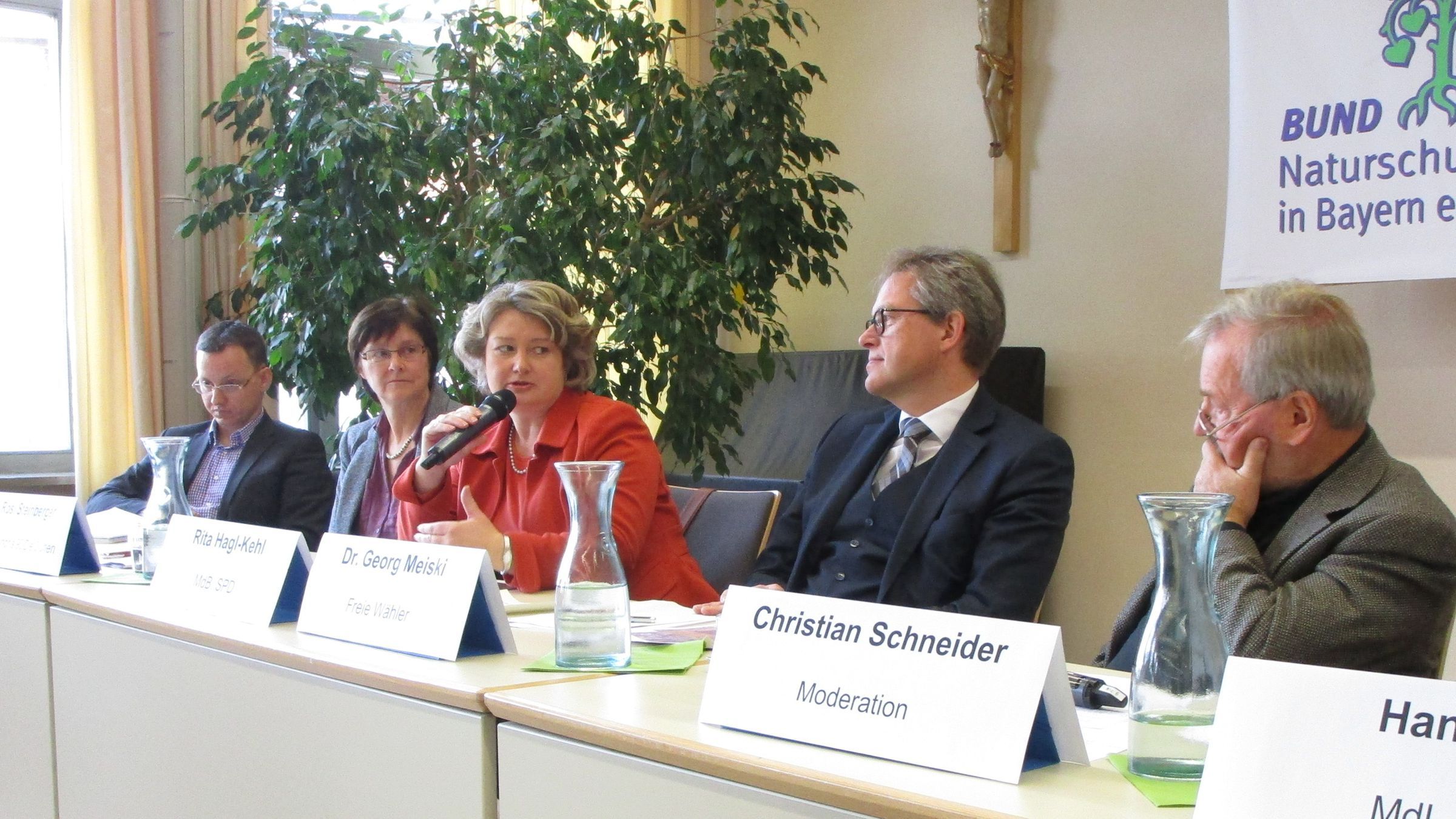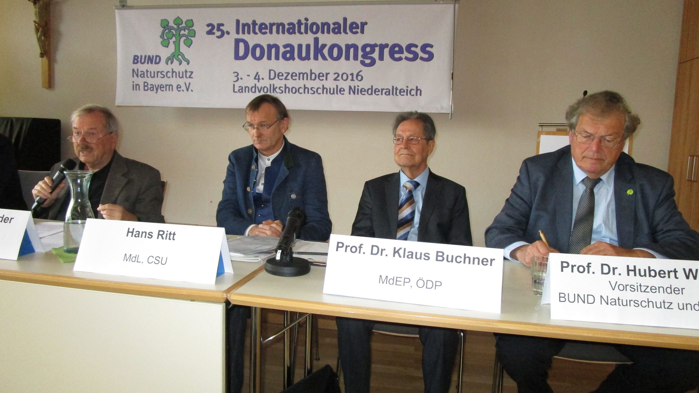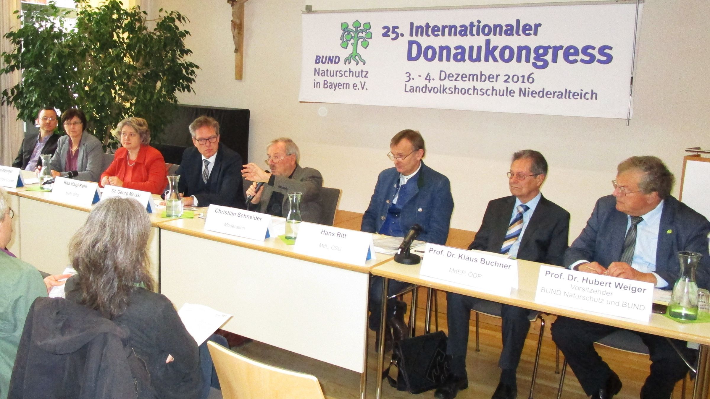 Moderiert von Christian Schneider diskutierten MdL Hans Ritt (CSU), MdB Rita Hagl-Kehl (SPD), Dr. Georg Meiski (Freie Wähler), MdL Rosi Steinberger (Bündnis 90 / Die Grünen), Stefan Hölzl (Die Linke), MdEP Prof. Dr. Klaus Buchner (ÖDP) und Prof. Dr. Hubert Weiger (BUND Naturschutz). Einen Schwerpunkt bildete dabei unter anderem der Hochwasserschutz. Thematisiert wurde nicht nur, dass der Hochwasserschutz im gesamten Einzugsgebiet der Donau, u.a. durch Uferrandstreifen entlang der Gewässer und durch eine Einschränkung des Maisanbaus auf problematischen Standorten verbessert werden muss; besonders nach einem Beitrag des Niederalteicher Bürgermeisters Albin Dietrich wurde deutlich, dass speziell für die Donaugemeinden die Finanzierungsaufteilung für die geplanten Deichneubauten einer eigenen, verbesserten Regelung bedarf. Aktuell wird die Vergabe der Deichbaumaßnahmen in Niederalteich, das vom Hochwasser 2013 nach einem Deichbruch bei Winzer massiv betroffen war, dadurch aufgehalten, dass wegen des außerordentlich hohen Kostenanteiles für die Kommunen bisher noch keine Finanzierungsvereinbarungen geschlossen werden konnten. Die Kongressteilnehmer sehen hier den Bund und Bayern in der Pflicht. Auch die auf dem Podium vertretenen Parlamentarier wollen sich in der nächsten Zeit unter anderem dieser Frage annehmen.