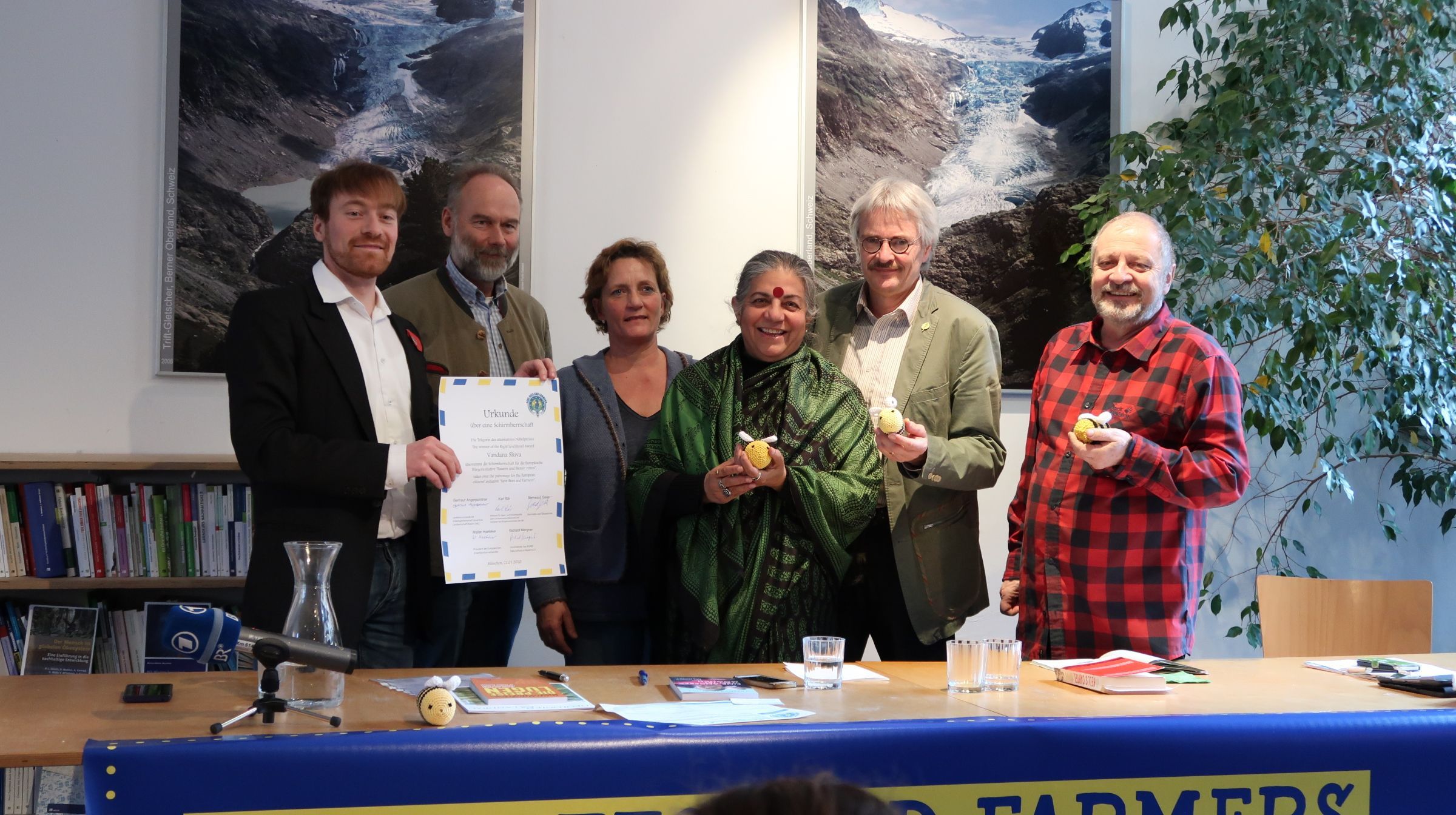 "Vandana Shiva ist bekannt als Kritikerin der Globalisierung. Ihre Patenschaft für die Europäische Bürgerinitiative macht deutlich, dass nicht nur der Kleinbauer in Indien zu den Verlierern der Globalisierung gehört. Auch im hoch entwickelten Europa und bei uns in Bayern vernichtet der sogenannte Strukturwandel unablässig landwirtschaftliche Existenzen. Die bayerischen Behörden prognostizierten bereits 2017 - lange vor dem Volksbegehren - eine weitere Halbierung der Betriebe bis 2030. Dieser hohe ökonomische Druck auf die Landwirte wird an unsere Ökosysteme weitergegeben. Vandana Shiva ist Inspiration und Vorbild für uns, denn Sie hat schon immer den Schutz von Bauern und Natur als Einheit gedacht und zu Recht die Systemfrage gestellt."