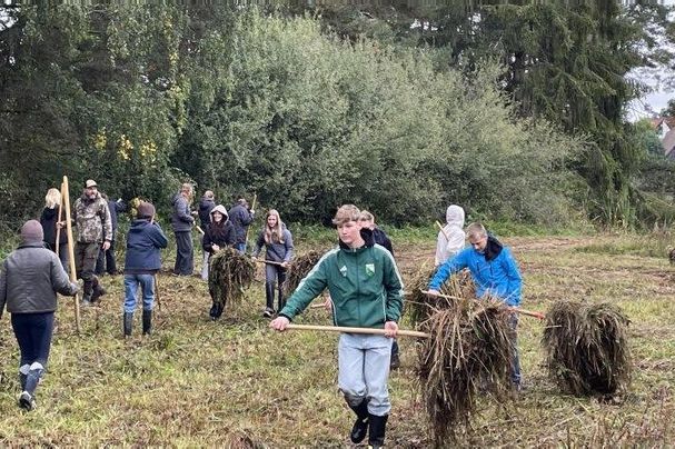 Zehntklässlerinnen und Zehntklässler des Gymnasiums Feuchtwangen halfen am Kaltenbronner Weiher bei Feuchtwiesenpflege