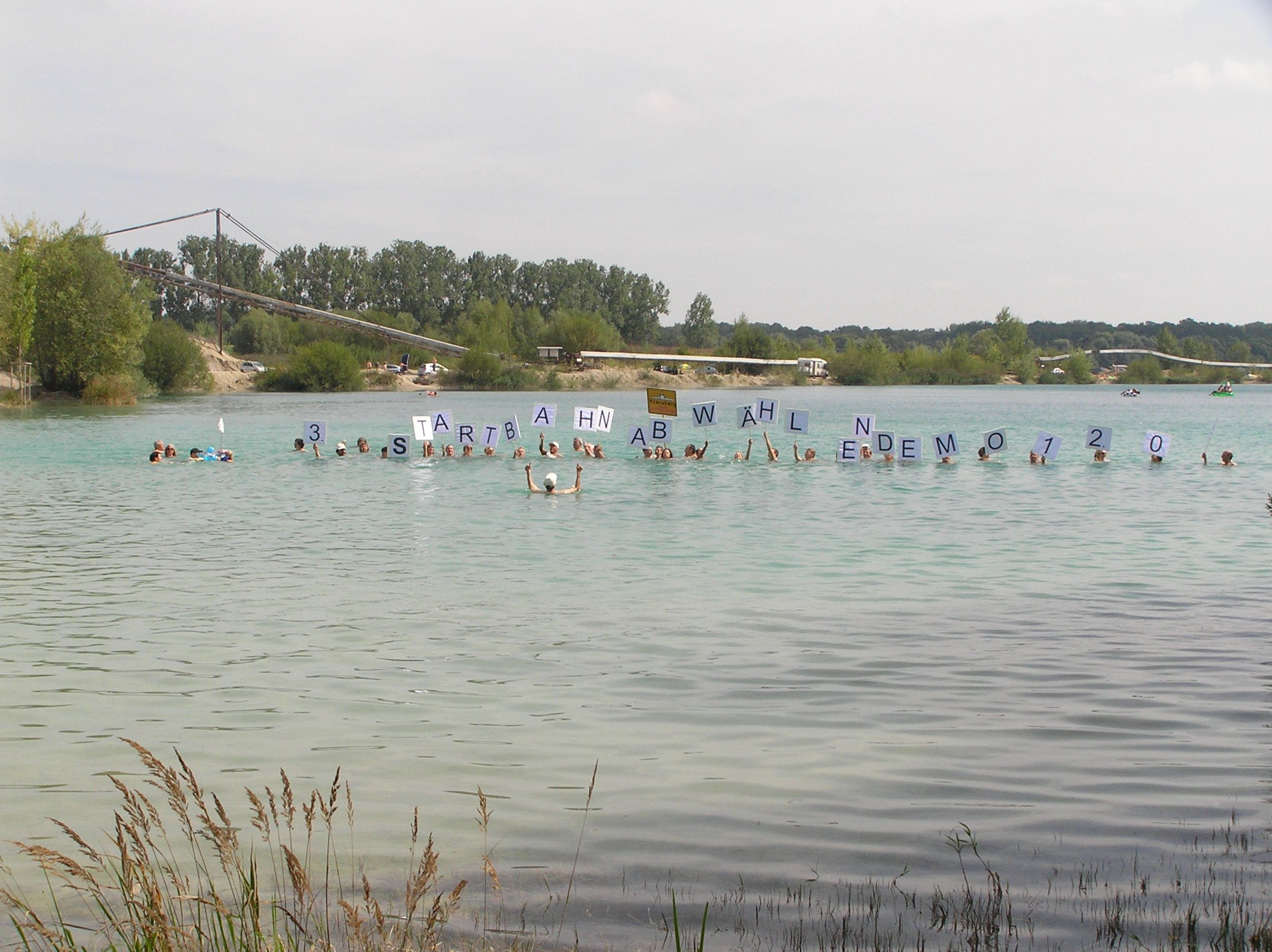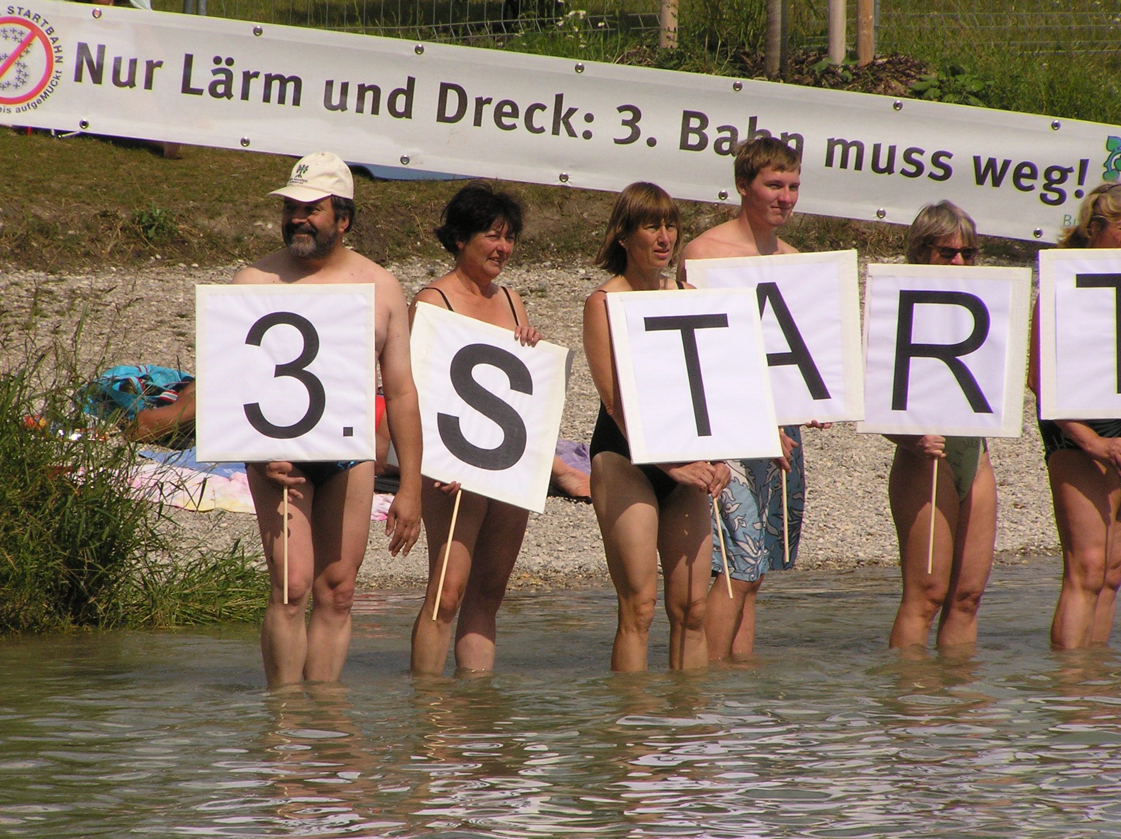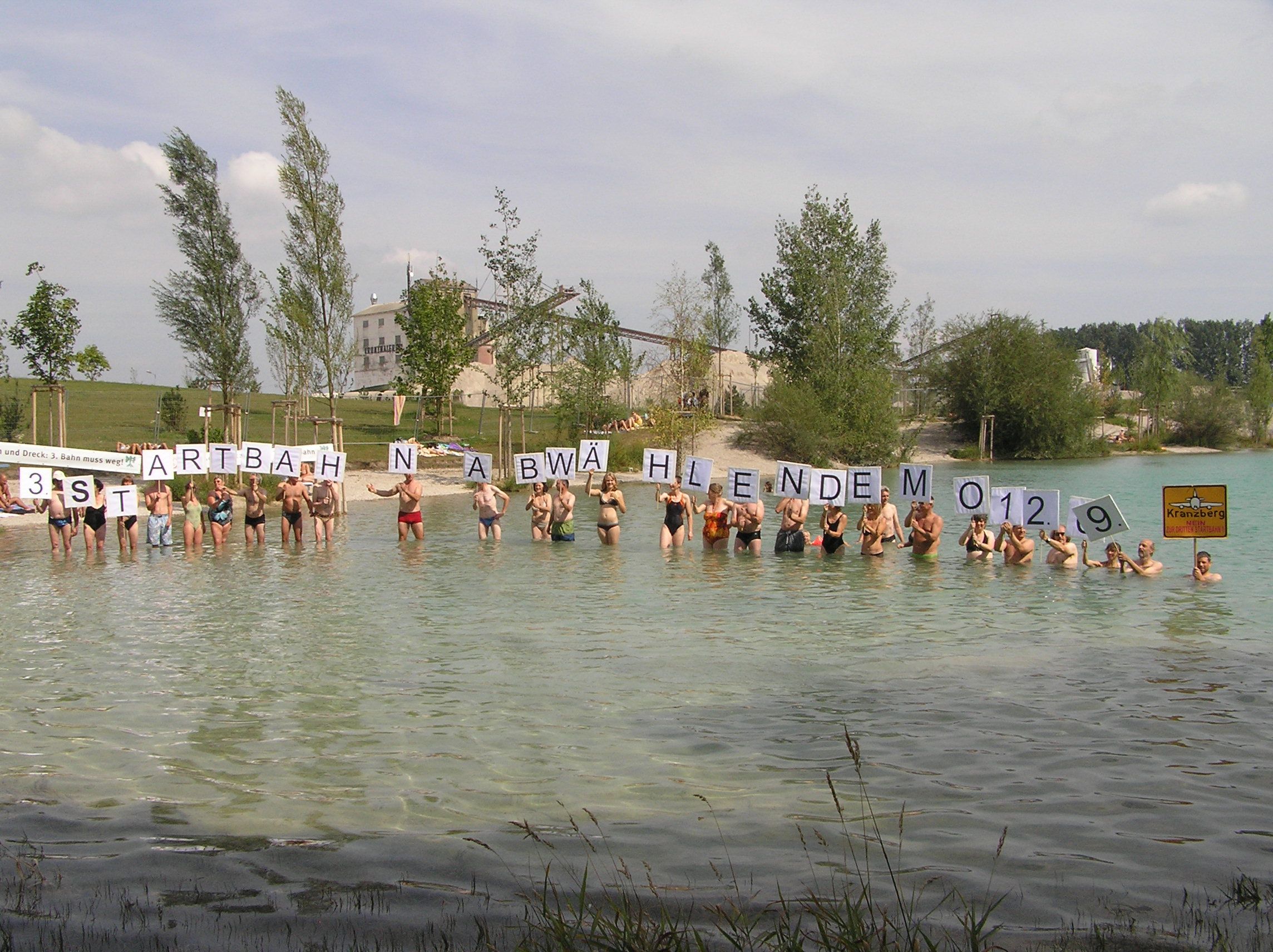 Im Pullinger Weiher forderten sie: „3. Startbahn abwählen – Demo 12.09.09“ (siehe Foto unten)