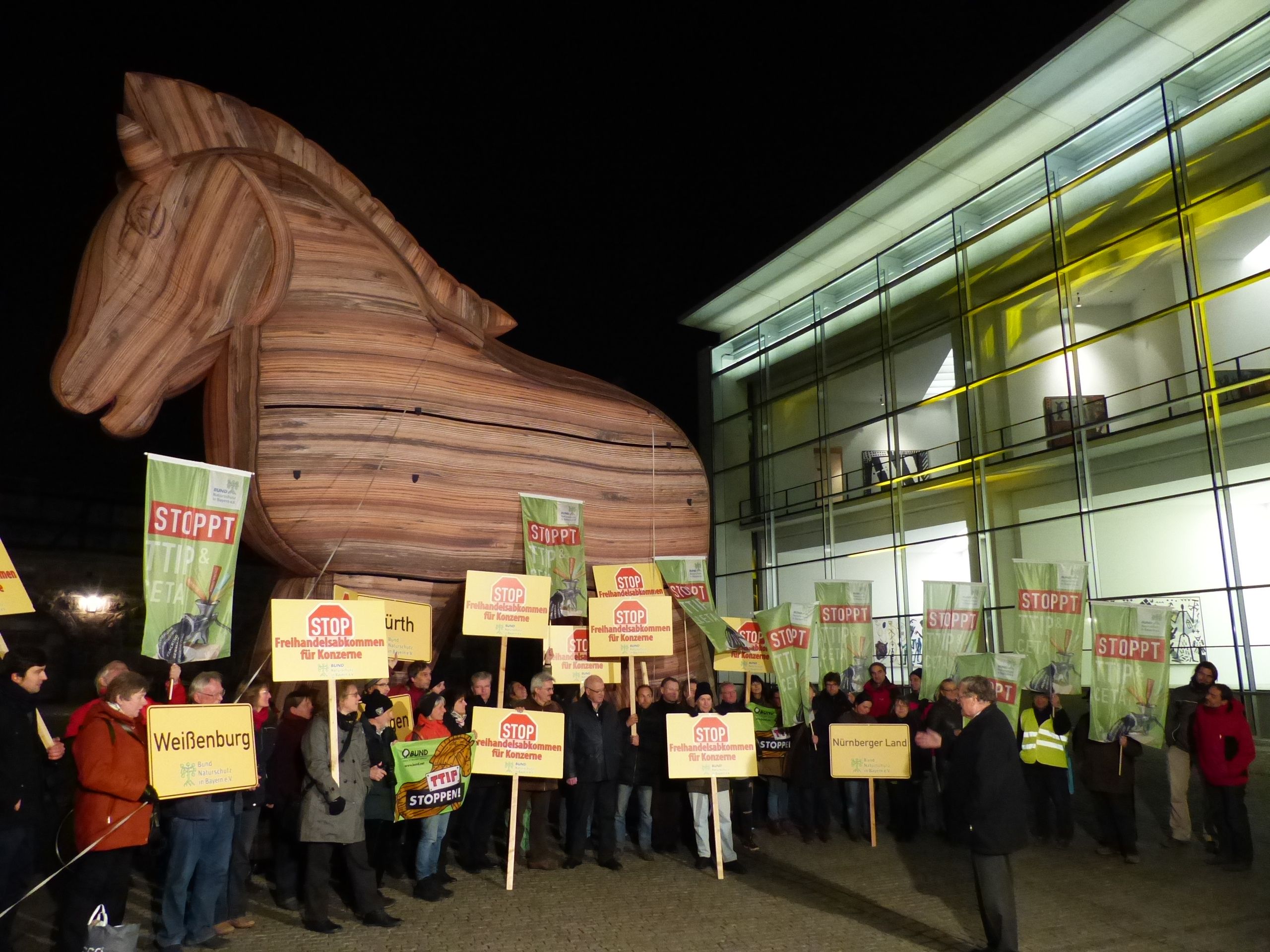 Auf dem Nürnberger Klarissenplatz hatten die Aktiven ein riesiges trojanisches Pferd aufgestellt und erläuterten die Gründe für ihre Ablehnung der Freihandelsabkommen. Der BN tritt gemeinsam mit dem Bündnis für eine Handels- und Investitionspolitik ein, die auf hohen ökologischen und sozialen Standards beruht und nachhaltige Entwicklung in allen Ländern fördert. Bayern habe von den Abkommen wenige Vorteile für einige Konzerne, aber große Risiken für Landwirtschaft, klein- und mittelständische Betriebe und die kommunale Selbstverwaltung sowie Demokratie zu erwarten.