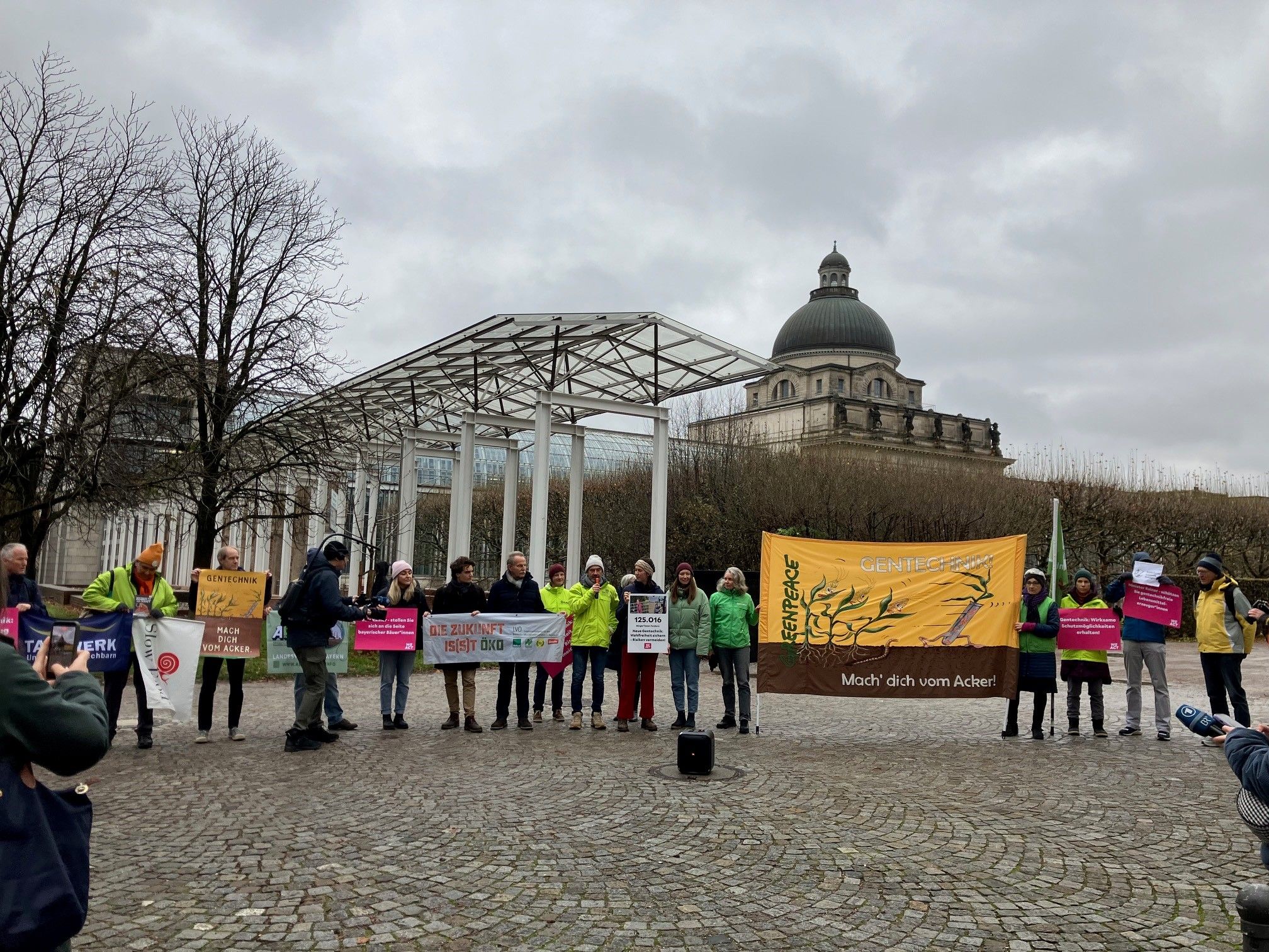 Mit einer Kundgebung am heutigen Dienstag (25.11.2025) vor der Staatskanzlei in München forderte das Bündnis Bayern für eine gentechnikfreie Natur und Landwirtschaft die zuständigen Politiker*innen aus Landes- und Bundesebene dazu auf, das Bayerische Naturschutzgesetz zu befolgen und dem Gesetzesvorschlag nicht zuzustimmen. Denn Bayern hat sich 2009 gesetzlich dazu verpflichtet gentechnikfrei zu sein - und das soll auch so bleiben.