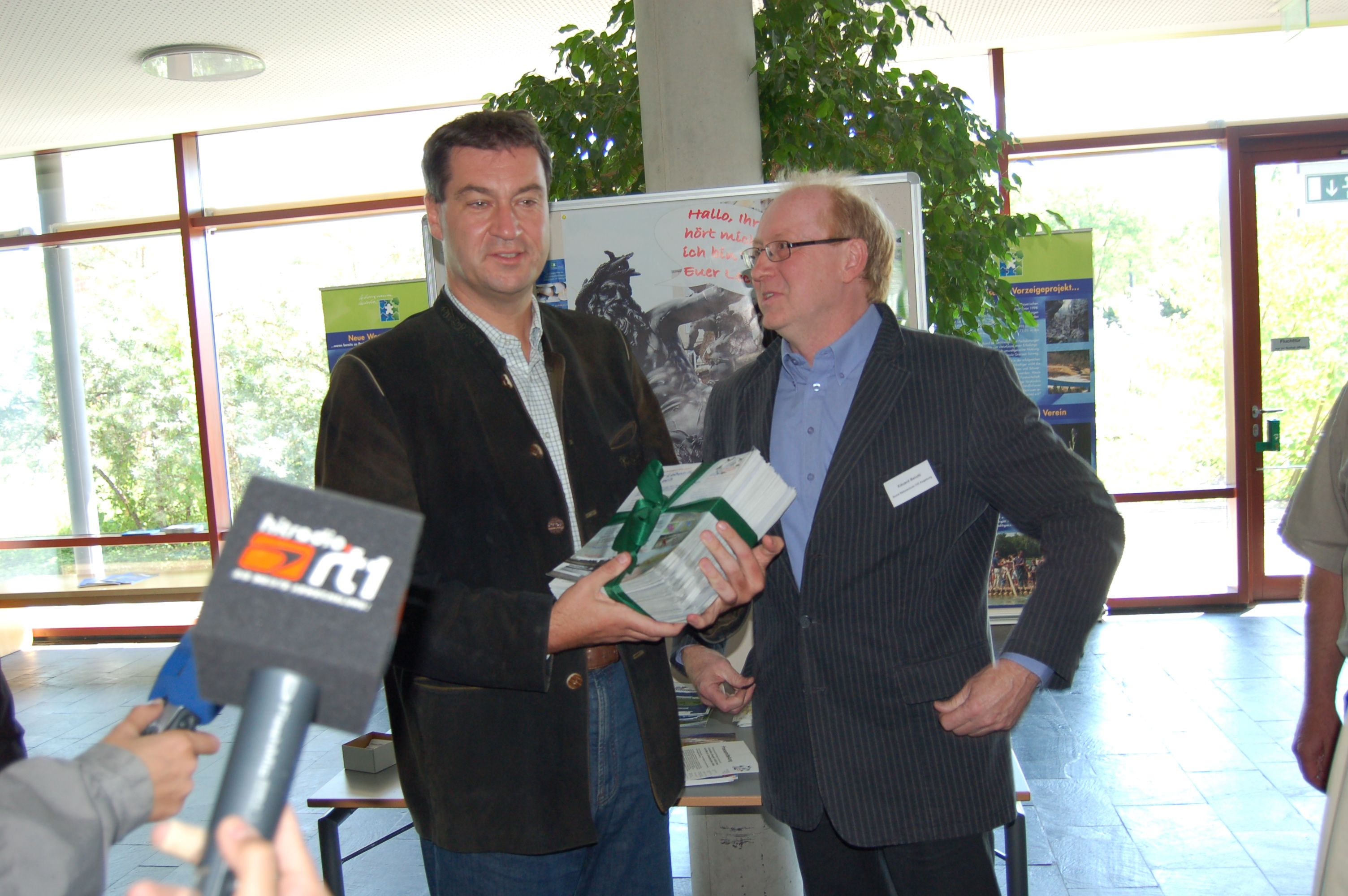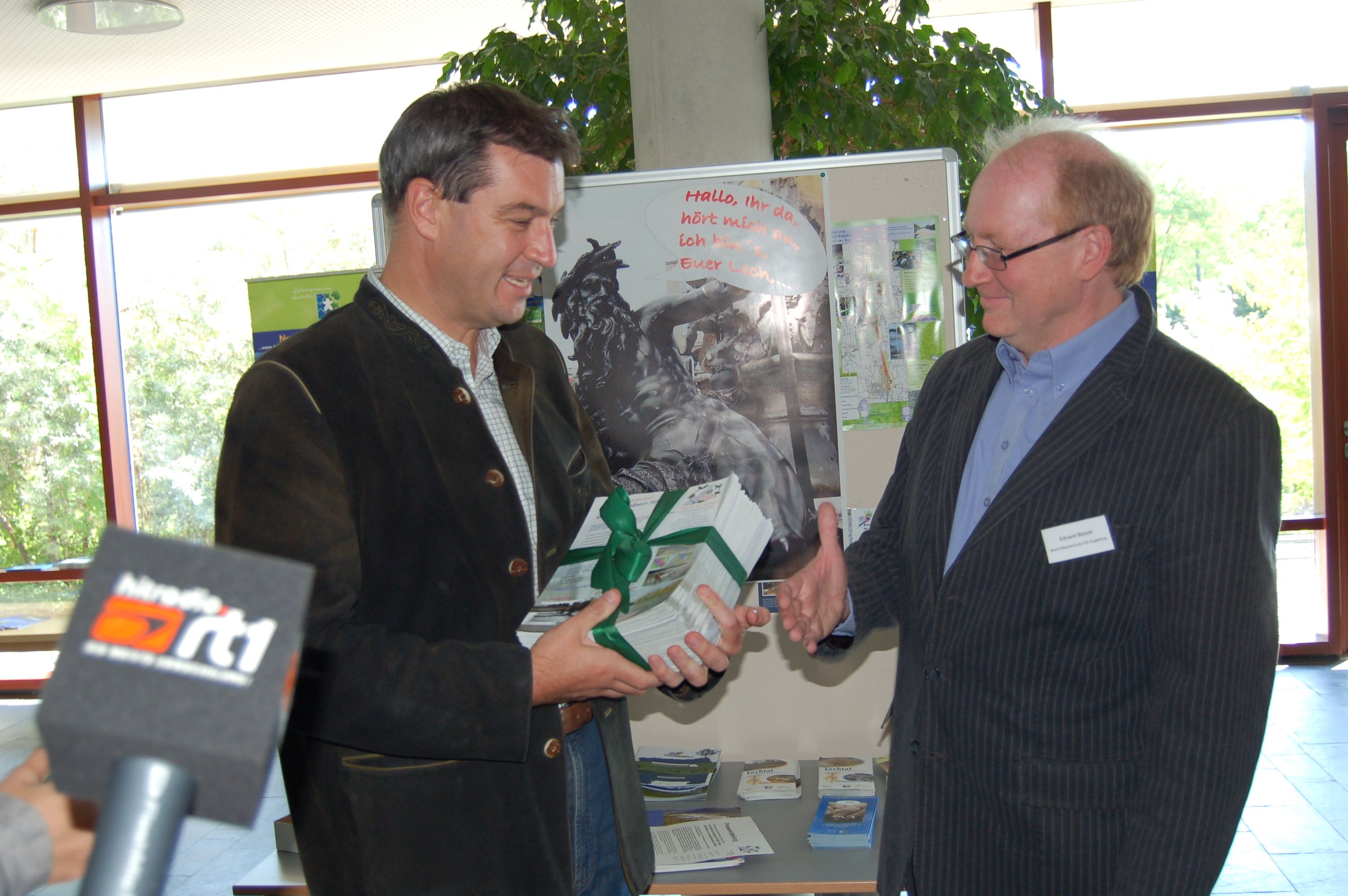Eduard Belotti, Vorsitzender der BN-Ortsgruppe Augsburg übergibt die Unterschriften an Umweltminister Söder.