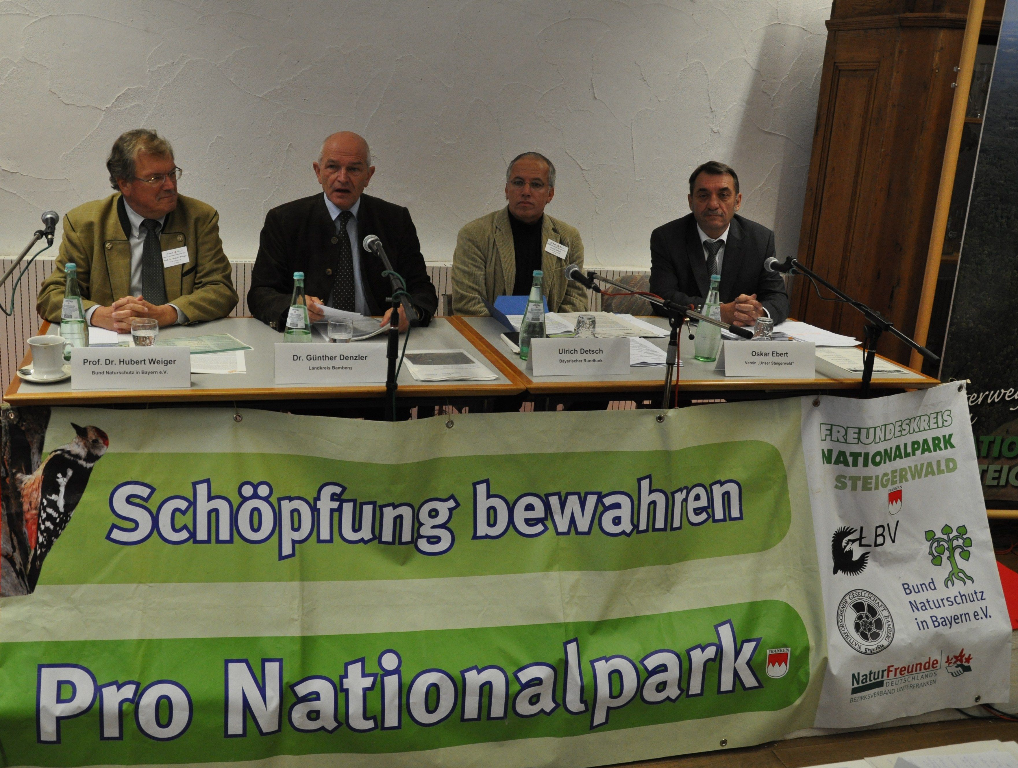 Die Befürworter eines großen Staatswaldschutzgebietes im nördlichen Steigerwald wollen gemeinsam mit dem Verein „Unser Steigerwald“, der einen Nationalpark ablehnt, die Fachdiskussion um die Zukunft der Region führen. Dies ist das Ergebnis der vierten Fachkonferenz in Ebrach zum Thema Naturerbe Buchenwälder mit 100 Teilnehmern aus ganz Deutschland. In der abschließenden Podiumsdiskussion betonten der Bamberger Landrat Dr. Günther Denzler, der BN-Vorsitzende Prof. Dr. Hubert Weiger und Bürgermeister Oskar Ebert, stellvertretender Vorsitzenderdes Vereins „Unser Steigerwald“, die Notwendigkeit, „den Blick noch Vorne zu richten“ und wollen sich bei Achtung der unterschiedlichen Positionen für eine bessere Gesprächskultur einsetzen. Für Hubert Weiger wird ein zukünftiger Nationalpark Steigewald Thema im Landtagswahlkampf 2013 werden. Landrat Denzler verwies auf den Auftrag im Kreistagsbeschluss des Landkreises Bamberg, die Voraussetzungen für die Ausweisung als Weltnaturerbe zu schaffen, was ein großes Waldschutzgebiet mit eigener Verwaltung erfordere. Bürgermeister Ebert unterstrich seine Position, dass bei einer nachhaltigen Waldbewirtschaftung Schutzgebiete unnötig seien.