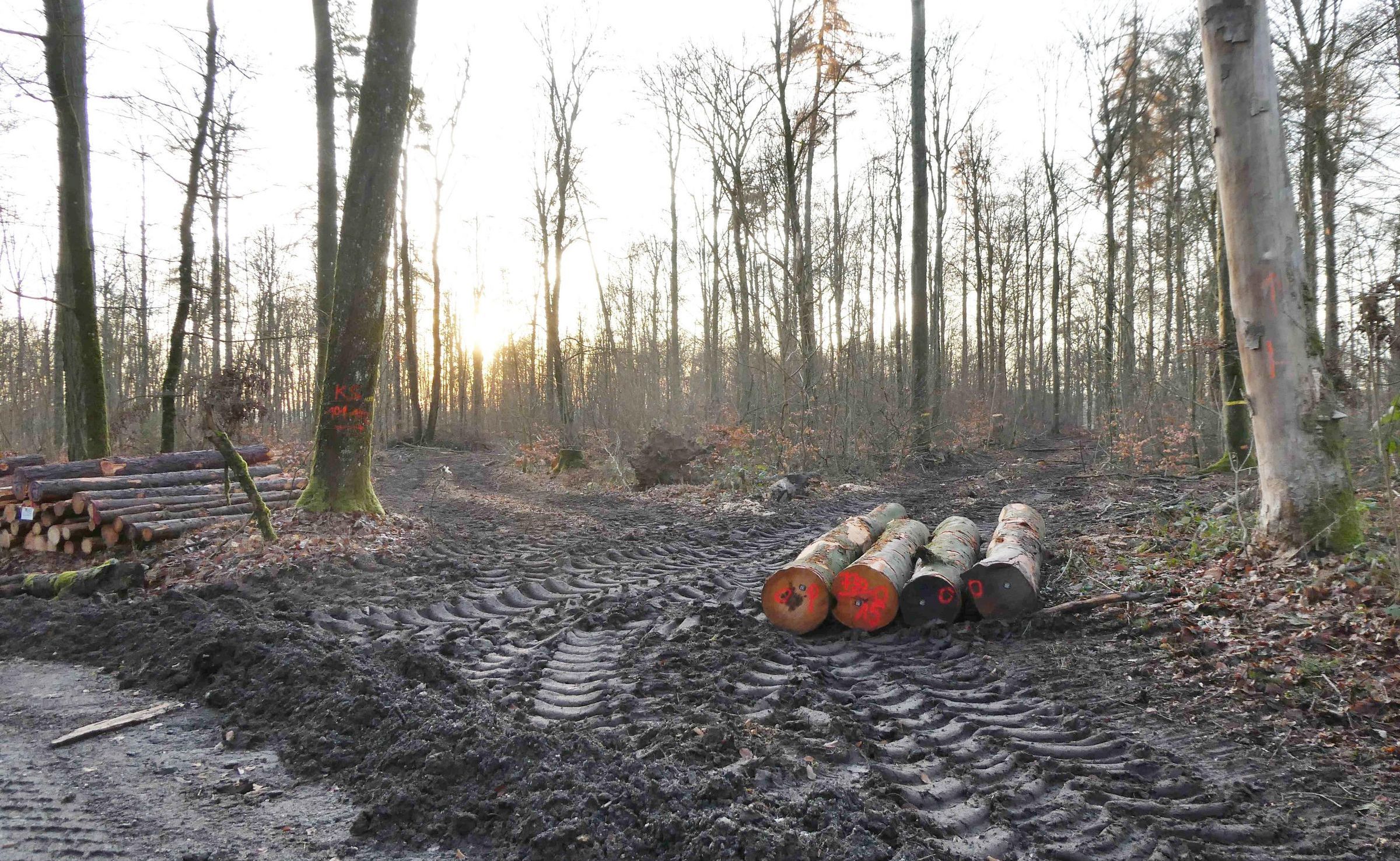 Auch im vormals geschützten Hohen Buchener Wald bei Ebrach werden wieder vermehr alte und ökologisch wertvolle Buchen gefällt. 2015 hatte die Staatsregierung das erst ein Jahr zuvor ausgewiesene Schutzgebiet wieder aufheben lassen (“Lex Steigerwald“).
