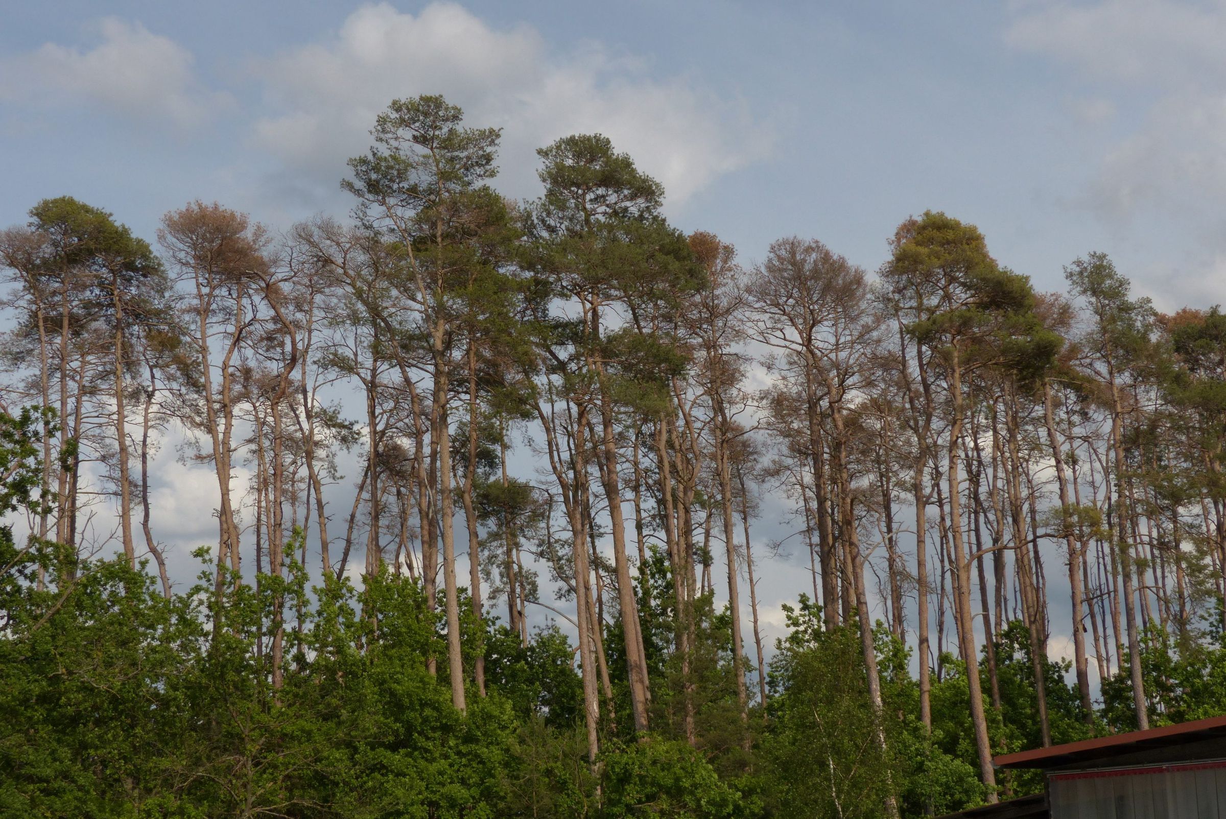 Die Klimakrise trifft die Wälder verschiedener Regionen Bayerns und Deutschlands sehr hart. Vor allem die Nadelbaumarten Kiefer und Fichte leiden unter den zunehmenden Klimaextremen Hitze, Trockenheit und Stürme. In Nordbayern und etlichen Bundesländern sterben in den tieferen und wärmeren Lagen immer mehr Kiefern ab, teilweise sogar ganze Wälder. "Wenn man durch in Deutschland fährt, sieht man an vielen Stellen tote Kiefern, die an den rot gefärbten Kronen gut zu erkennen sind", so Ralf Straußberger, Wald- und Jagdreferent des BN. Auch die Baumart Schwarzkiefer ist massiv betroffen, die bisher als besonders wärmetolerant gegolten hat. Der größte Schwarzkiefernbestand Deutschlands im Landkreis Würzburg ist zu ca. 80 % massiv geschädigt. In den Mittelgebirgen und in Südbayern rafft der Borkenkäfer zahlreiche Fichten dahin, die durch Hitze und Trockenheit so geschwächt sind, dass sie dem Borkenkäfer massenhaft zum Opfer fallen. Die Ausbreitung der Fichten-Borkenkäfer ist in einigen Privatwäldern so massiv, dass manche Waldbesitzer den Kampf gegen den Borkenkäfern aufgegeben haben. Es fehlen auch schlicht die Kapazitäten für die Aufarbeitung der Borkenkäferschäden. Als Alternativen zu diesen besonders gefährdeten Baumarten gelten Eichen, Buchen und Weißtannen, die eine moderate Erwärmung verkraften würden. Aber auch diese Baumarten stehen unter Stress und würden eine Klimaerwärmung von 4 bis 5 °C wohl nicht überleben. "Ein derartiges Mittelmeerklima würde wohl keine unserer heimischen Baumarten verkraften", so Straußberger. "Die bisherigen Waldumbaubemühungen, d.h. die Unterpflanzungen der Waldbesitzer und Förster sind gefährdet, wenn die Politik nicht endlich beim Klimaschutz handelt". Eine weitere Verschärfung des Baum- und Waldsterbens würde zahlreiche zentrale Leistungen dieser Wälder für die Daseinsvorsorge stark beeinträchtigen und gefährden. Dies beträfe den Trinkwasser-, Hochwasser-, Klima-, Boden-, Lawinen- und den Biotopschutz dieser Wälder, so z.B. die Trinkwasserversorgung und die Bewohnbarkeit des Alpen- und Voralpenraums sowie der Flusstäler.