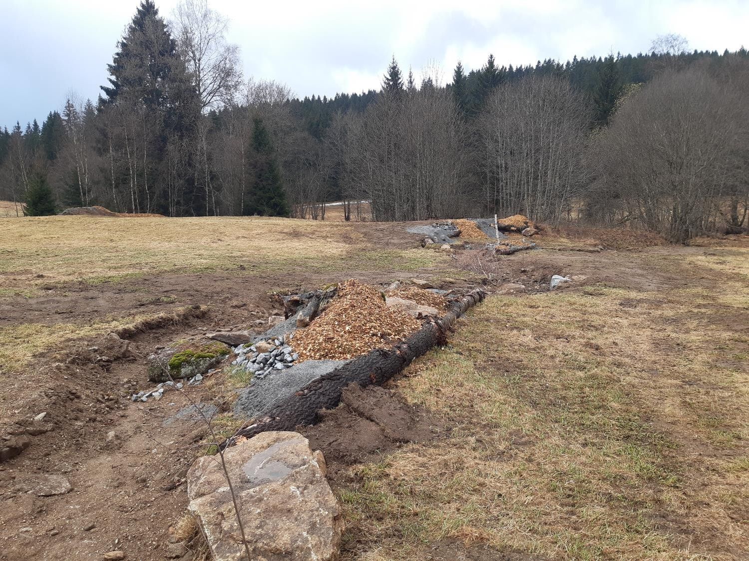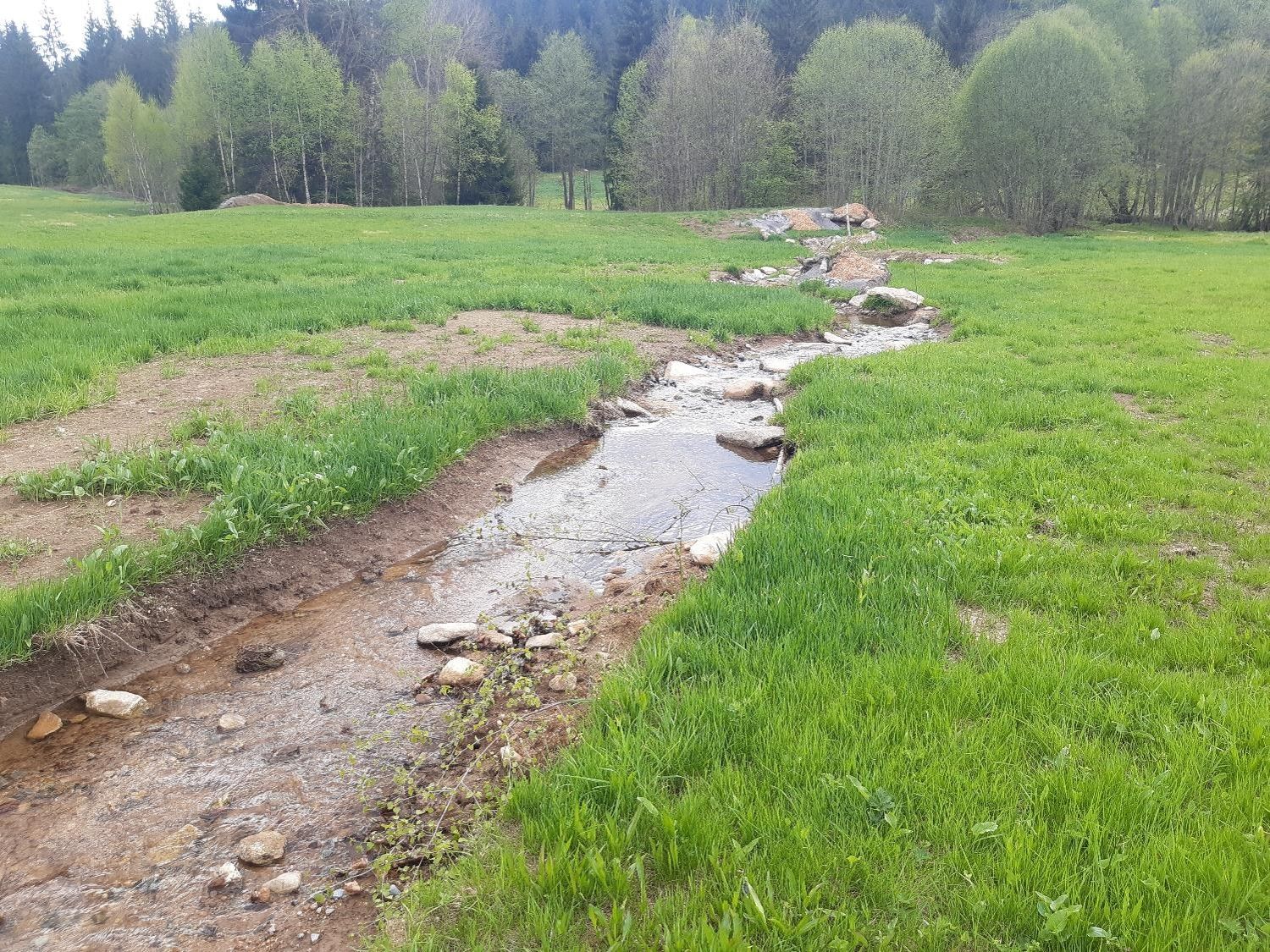 Unmittelbar nach der Schneeschmelze im Frühjahr 2025 wurde bei hervorragend trockener Witterung der Bachlauf der Hochmaisseige (Zufluss zum Saußbach, Gemeinde Mauth) befreit. Er verlief bislang unterirdisch in Rohren. Die wurden zunächst ausgegraben. An der Oberfläche wurde dann ein komplett neuer, geschlungener Bachlauf mit vielfältiger Gewässerstruktur angelegt. Neben Steinen wurden starke Totholzstämme und Birkenkronen für die Gestaltung verwendet. An den Uferböschungen wurden Strukturen für Reptilien angelegt. Durch Pflanzung von Mädesüß und Förderung anderer Hochstauden, wurde der Grundstein für die Entstehung von Staudenfluren gelegt. Die Ufer wurden außerdem mit Grau- und Schwarzerle bepflanzt sowie mit Weidenstecklingen versehen, um den Gewässerlauf zu sichern und mittelfristig besser zu beschatten. Das neue, renaturierte Gewässer mit einer Länge von ca. 90 Metern hat den ersten Hochwässern gut standgehalten.