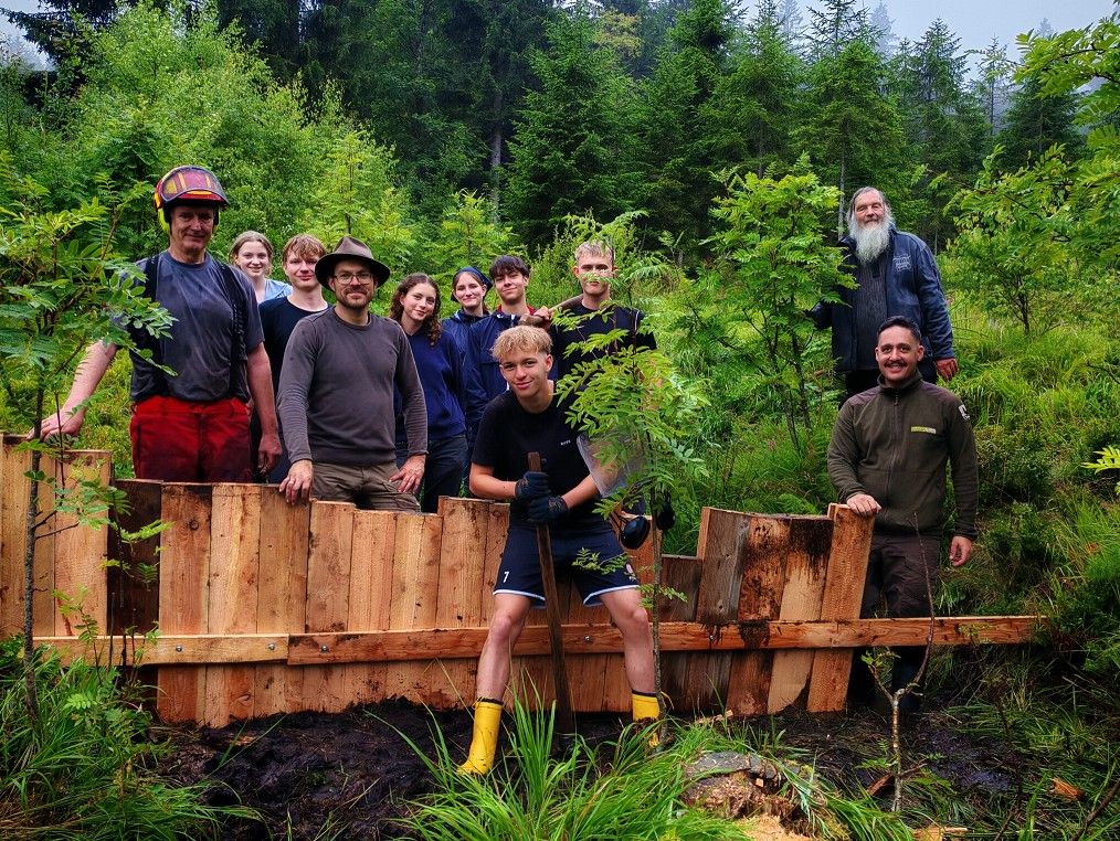 Unter fachkundiger Anleitung wurden Maßnahmen zur Stabilisierung und Verbesserung des Wasserhaushalts auf einer anmoorigen Feuchtwiese umgesetzt. Am Ende kamen alle nass und dreckig, aber voller neuer Eindrücke und stolz auf die geleistete Arbeit in die Unterkunft zurück.