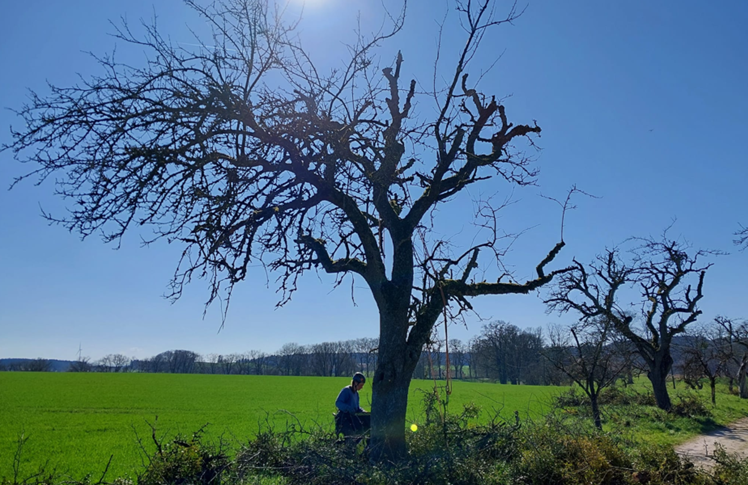 Damit Streuobstwiesen erhalten bleiben und für Artenvielfalt und Biotopvernetzung wertvoll sind, müssen sie fachgerecht gepflegt werden. Die Obstbäume brauchen einen regelmäßigen und fachgerechten Schnitt. Der Aufwand ist bei jüngeren Bäumen gering. Bei älteren Bäumen kann das durchaus mehrere Stunden dauern, wenn der Baumpfleger oder die Pflegerin in den Baum klettern muss. Ohne diesen Schnitt könnten Bäume sich nicht gut entwickeln und durch das Gewicht der vielen Früchte Äste abbrechen. Insbesondere Jungbäume haben nur mit konsequenter Pflege in den Jugend- und Erziehungsjahren eine Chance gegen den Klimawandel. Das bedeutet in den ersten Jahren insbesondere Gießen während der Trocken- und Hitzephasen im Jahr.