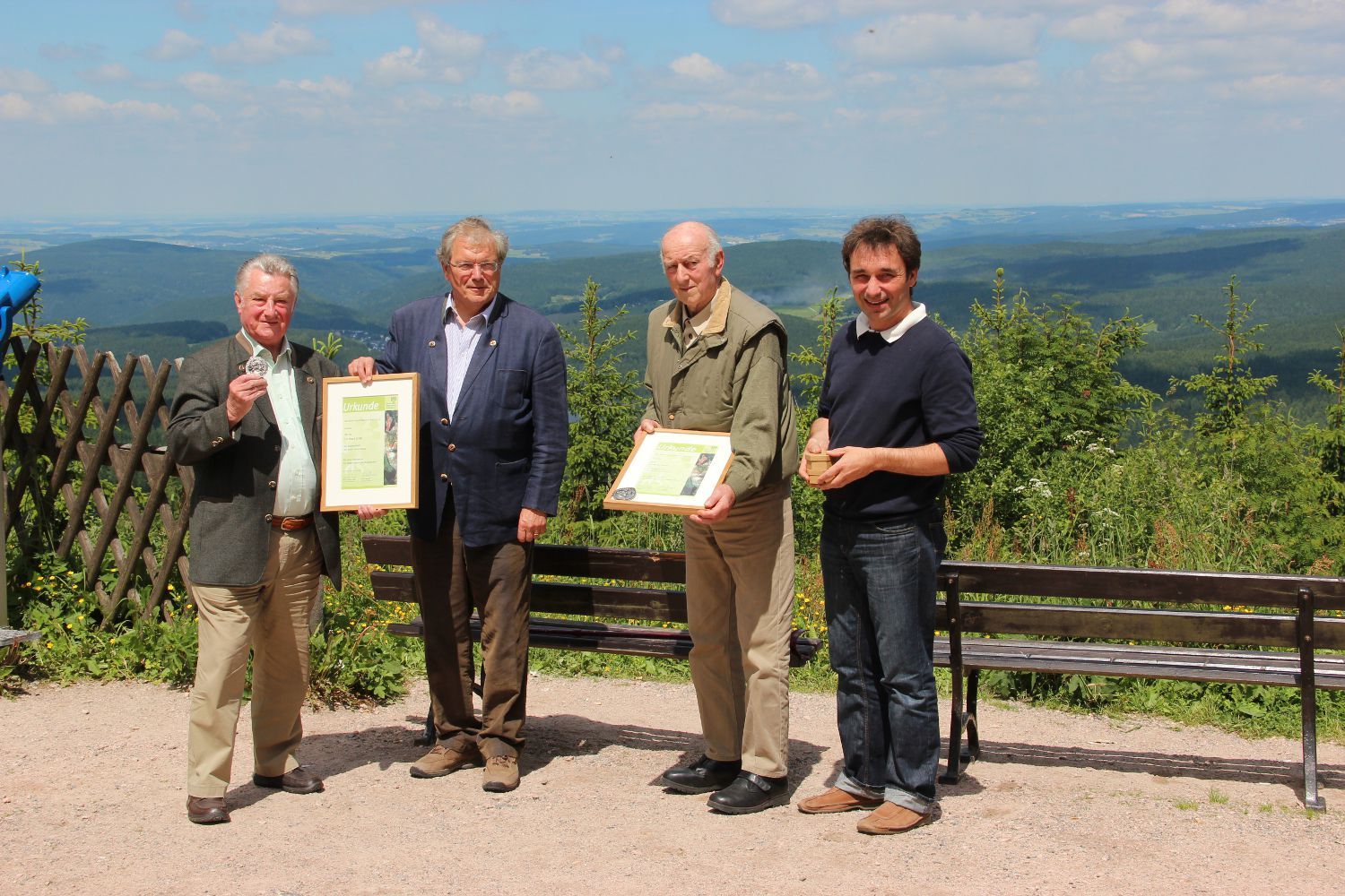 Im Rahmen einer internationalen Pressefahrt ins Erzgebirge zum Thema "30 Jahre Waldsterbens‐Debatte" ehrte der BN den ehemaligen Bayreuther Stadtförster Gotthard Eitler und seinen Forstkollegen Ludwig Hahn aus Sosa im Erzgebirge für ihre Verdienste beim Kampf gegen das Waldsterben.